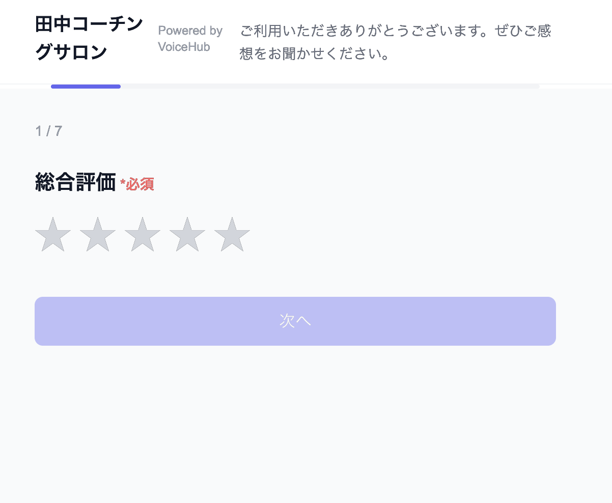 星評価、Before/After、写真アップロード。ステップ形式でお客様が答えやすいから回答率が上がります。